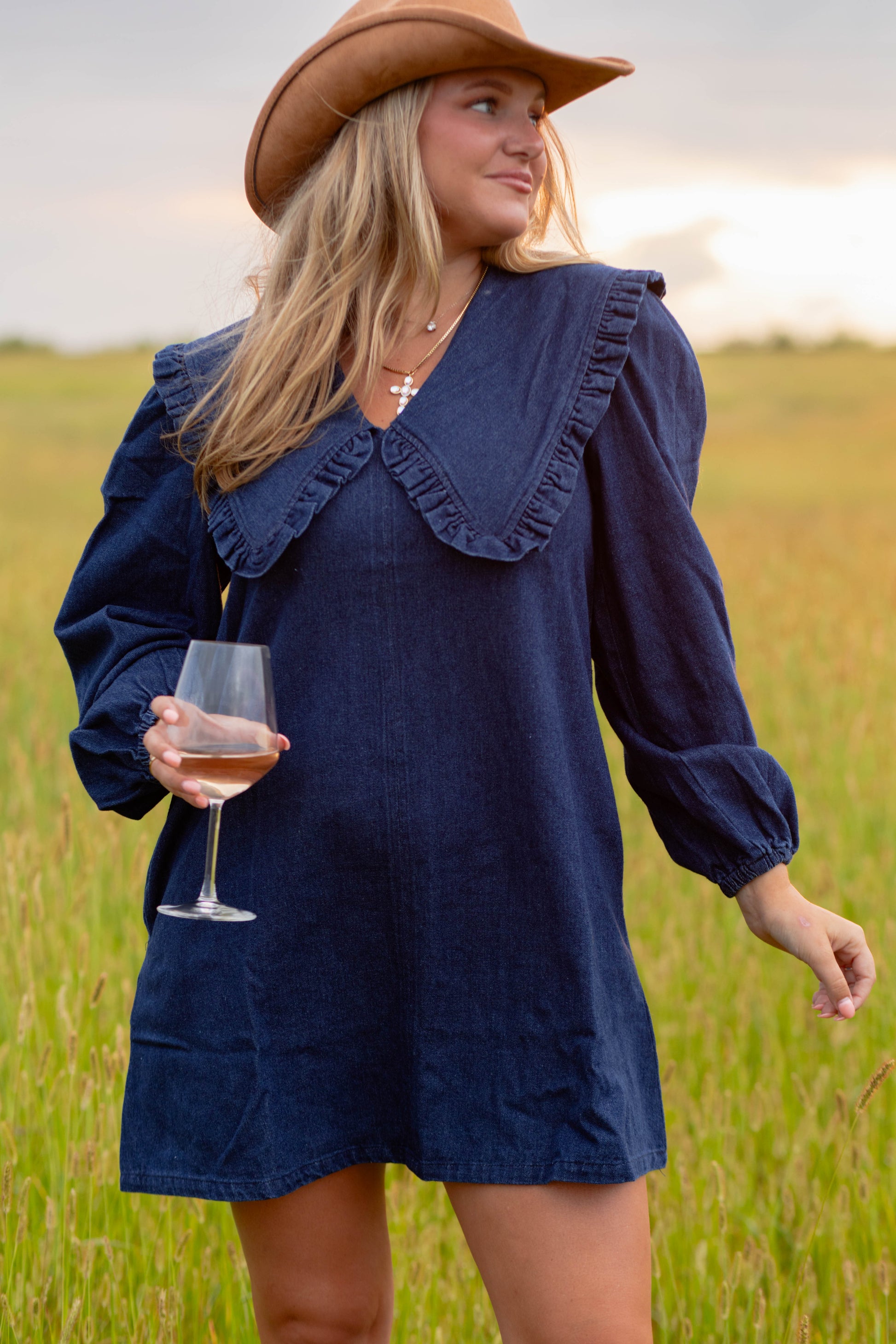 Long Sleeve Relaxed Fit Ruffled Collar Denim Dress with side pockets.
