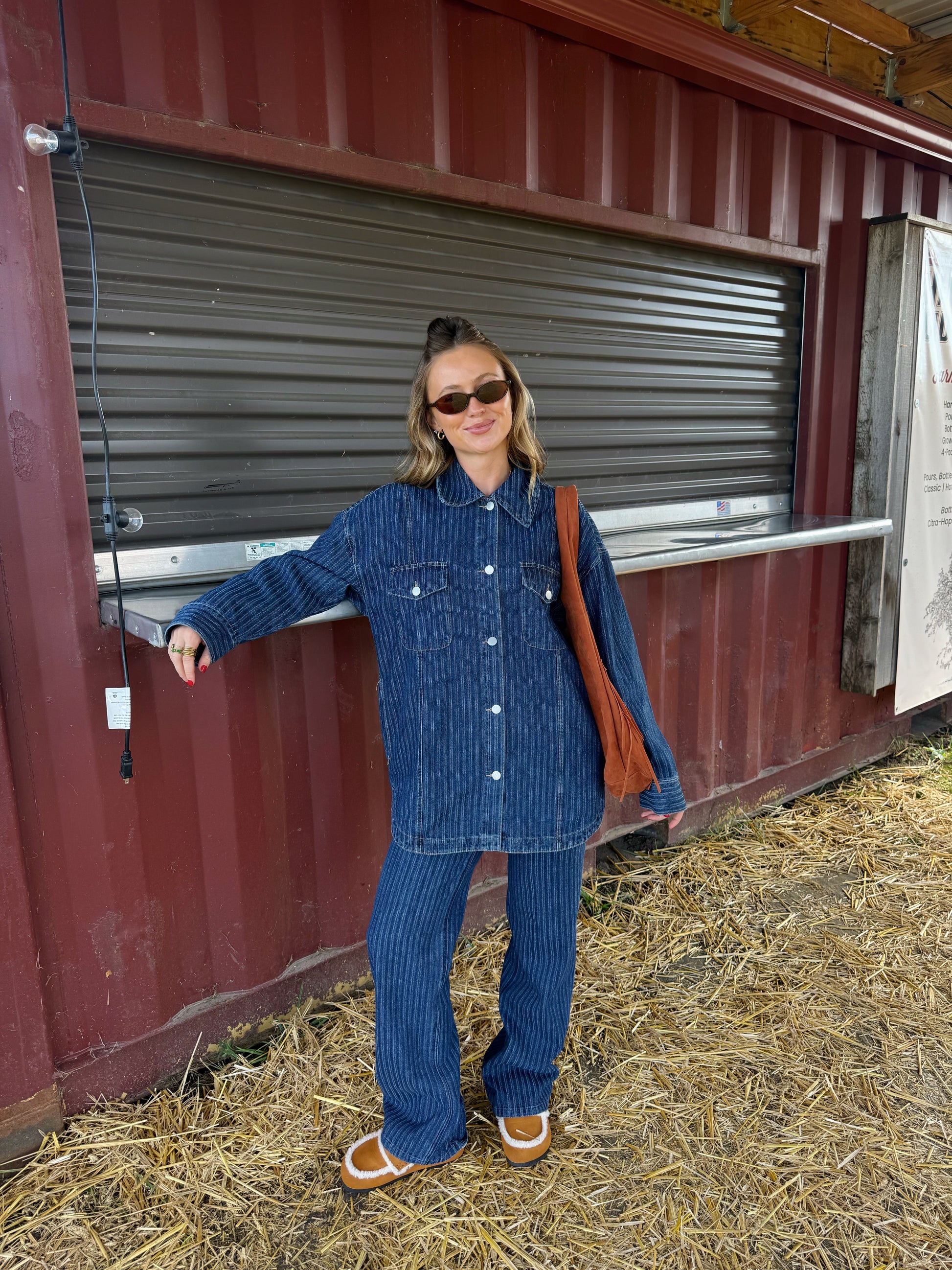 Striped textured denim casual straight pants.