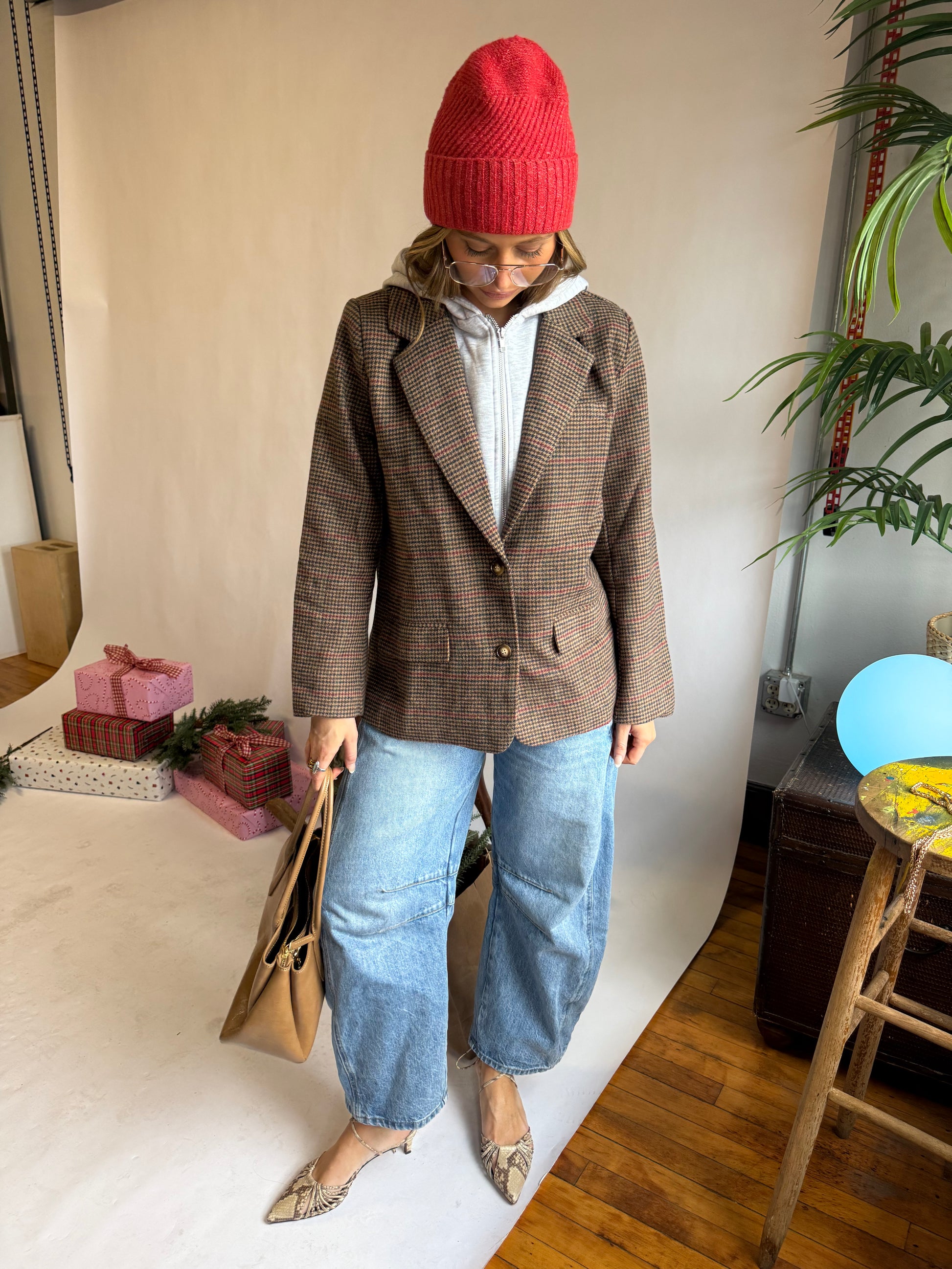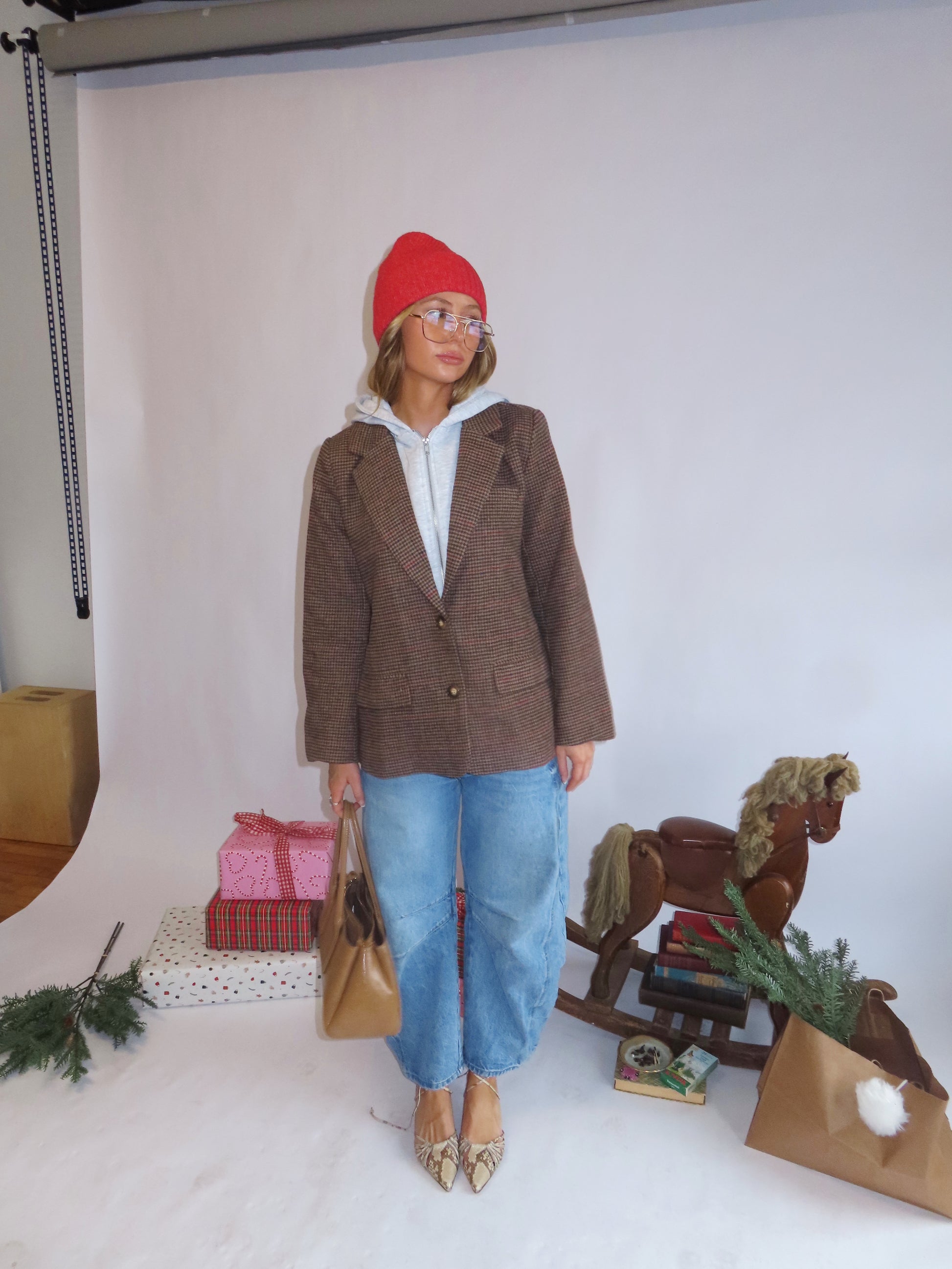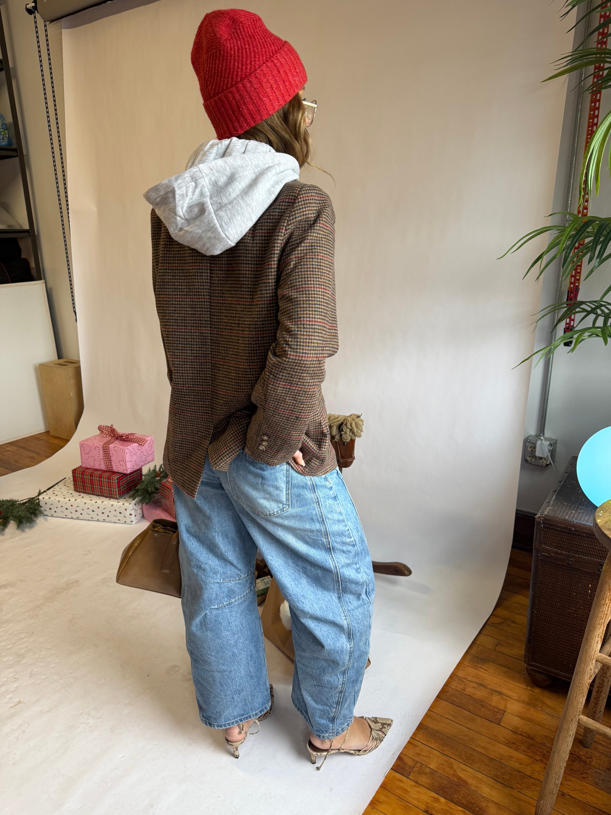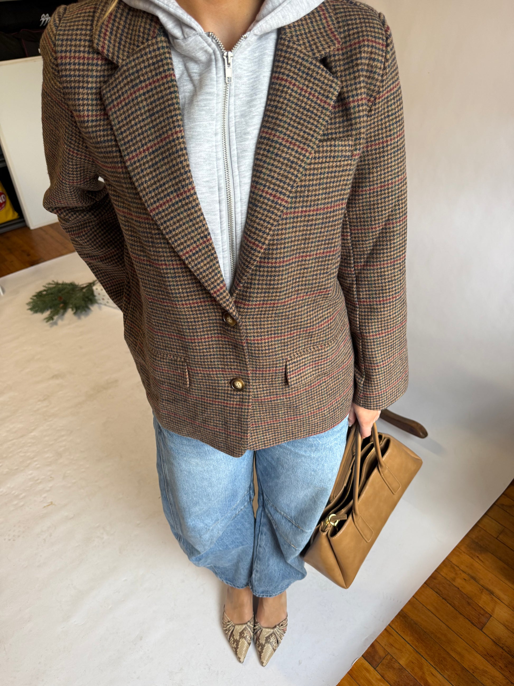 Oversized houndstooth blazer. Layered look, no effort required. This tailored blazer comes with an attached zip-up hoodie insert for an effortlessly cool, street-meets-chic vibe. The soft heather-grey hoodie lining is not removable, giving the piece a layered look that’s built in for ease and style. Designed in a classic plaid pattern with structured shoulders, flap pockets, and button cuffs — perfect for tossing on over a skirt or jeans for a polished, laid-back outfit.