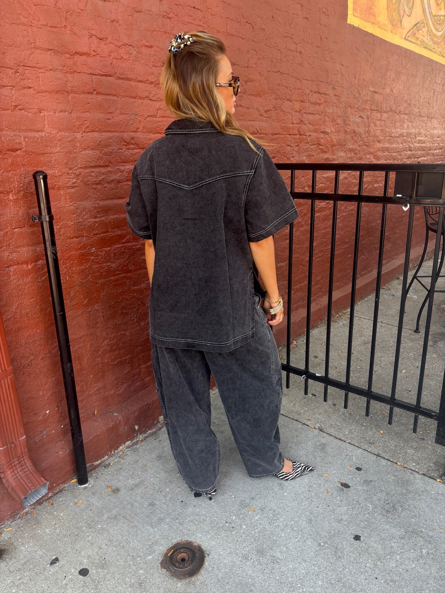 Garment washed contrast stitch cotton shirt and soft cotton washed barrel leg pants.