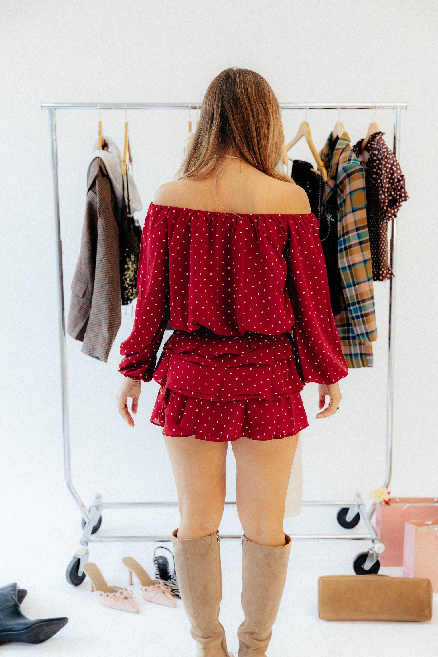 Burgundy Off Shoulder Top with Polka Dot Print.