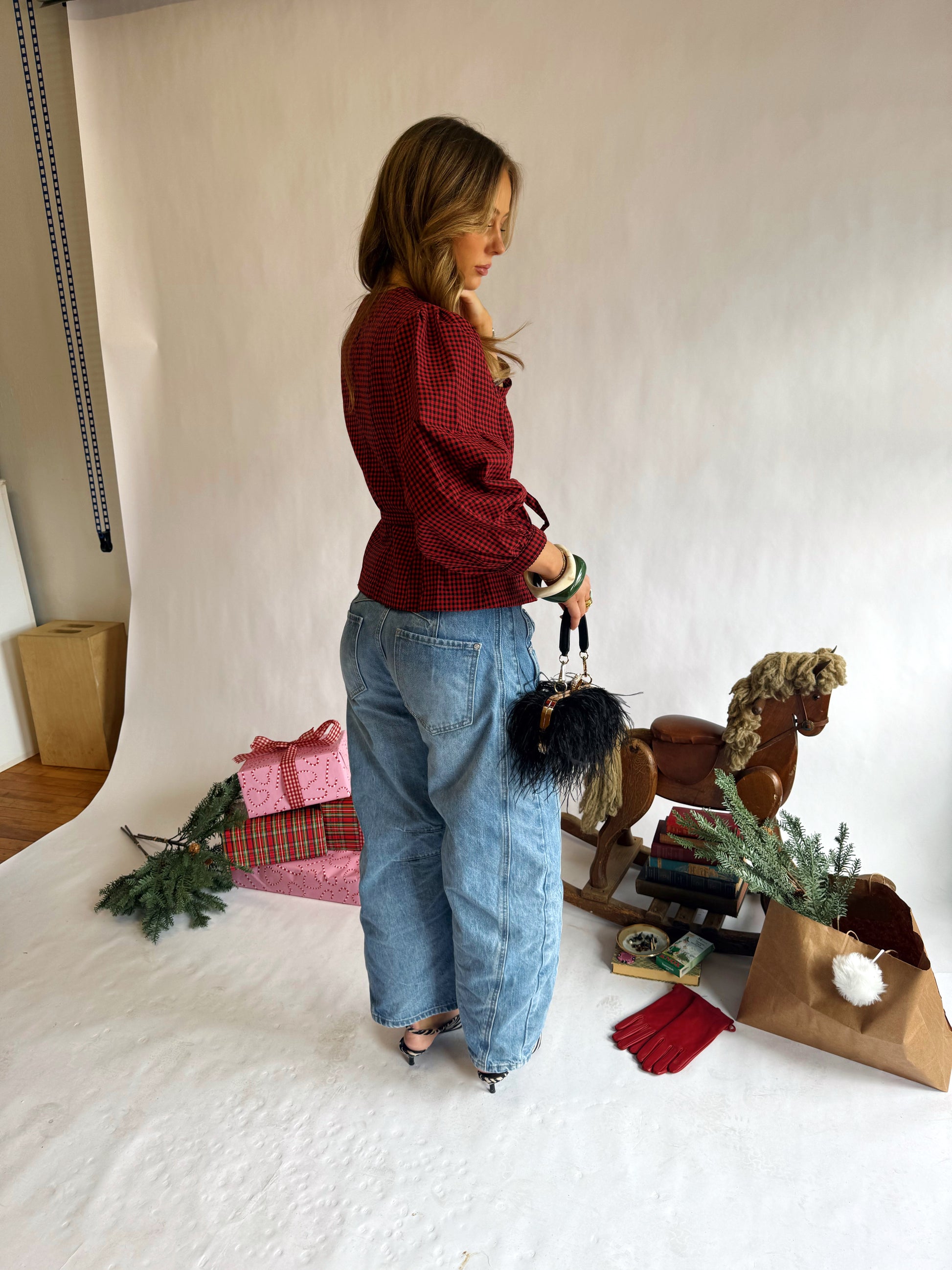 Red and black checkered button down long sleeve blouse with adjustable waist band.