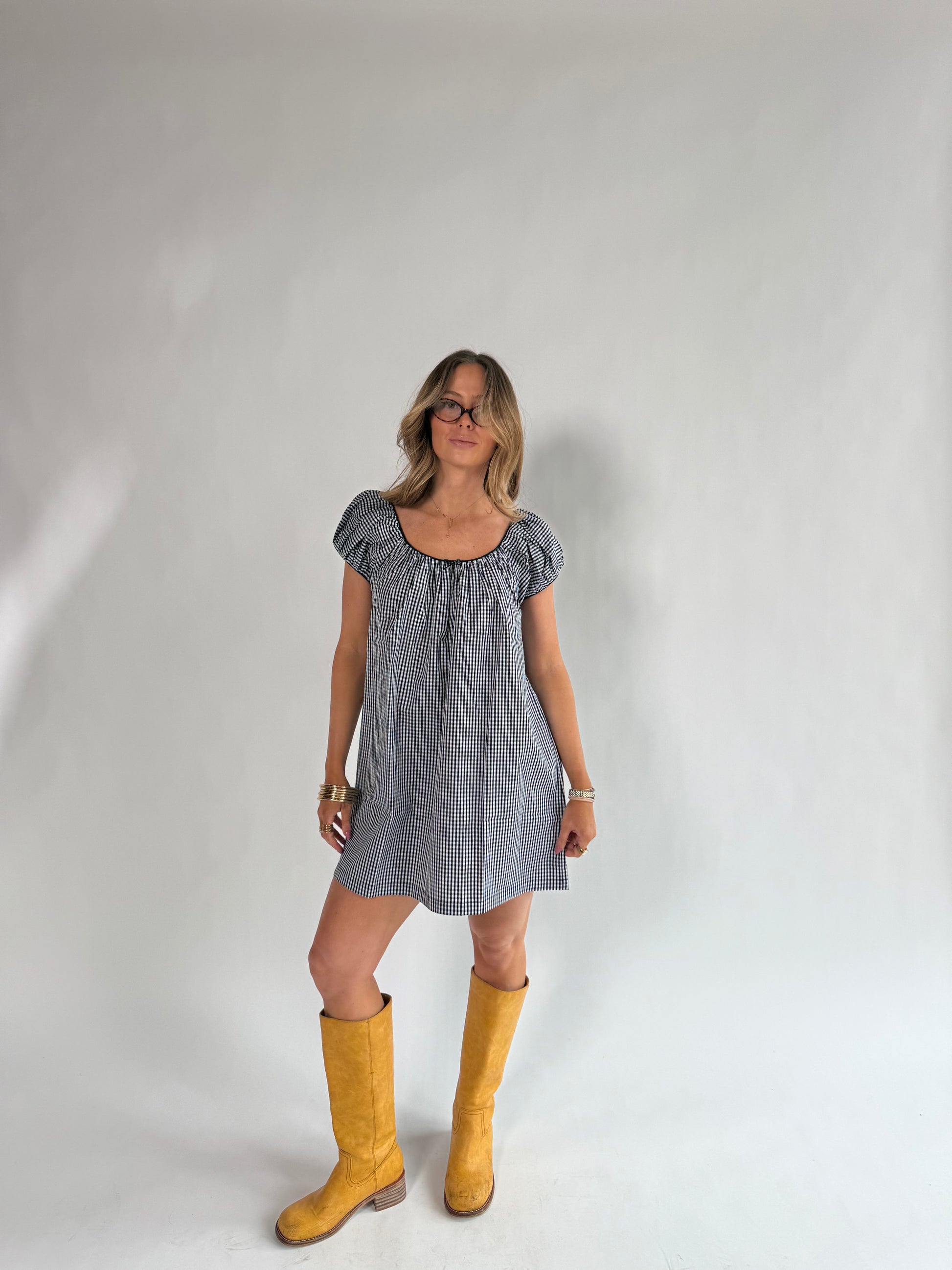 Black and white gingham baby doll dress with bow detail. Soft gathered neckline with puff sleeves and a relaxed A line silhouette with a lightweight crisp cotton fabric.