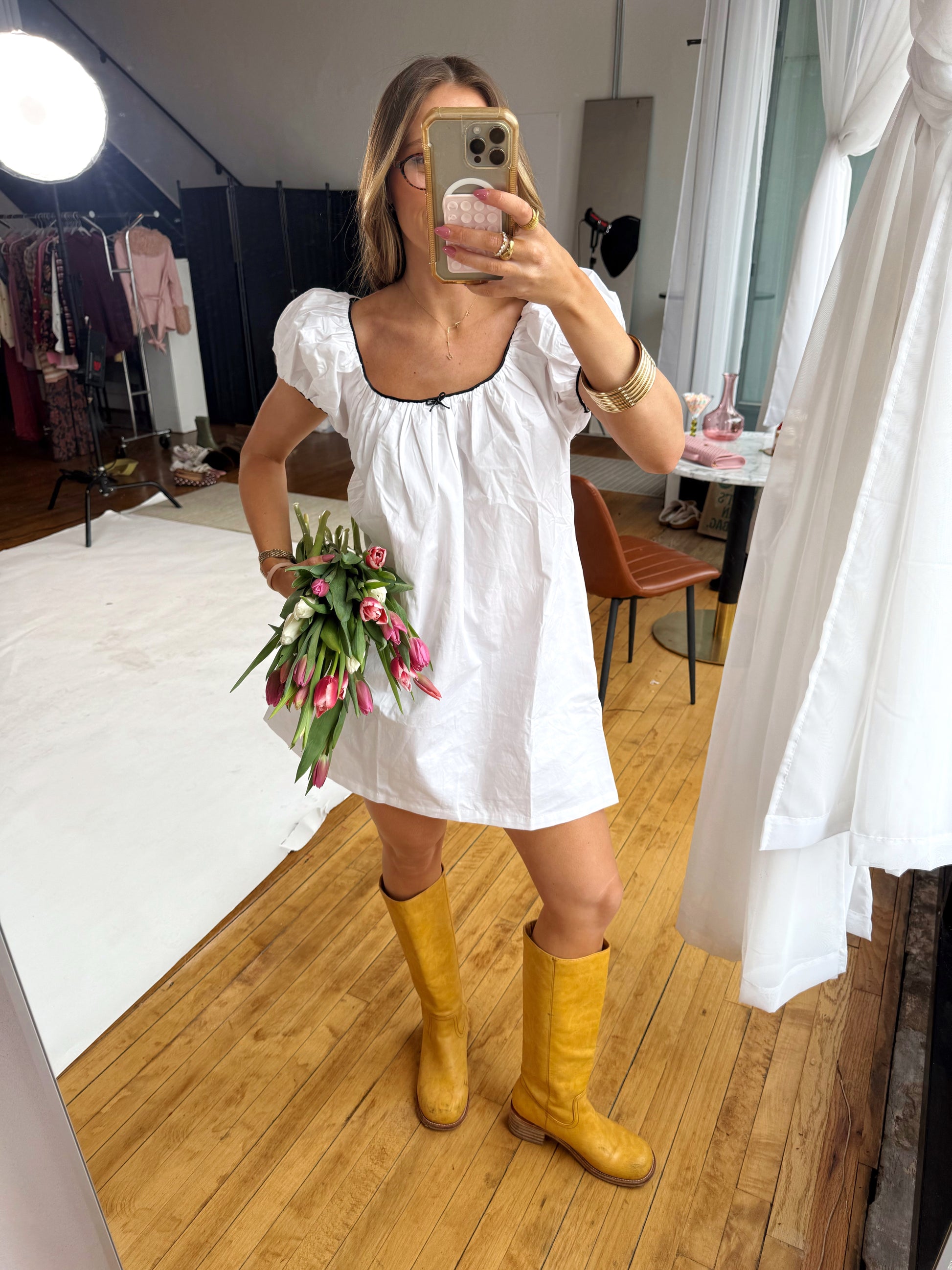 White baby doll dress with black detail lining. Soft gathered neckline with puff sleeves and a relaxed A line silhouette with a lightweight crisp cotton fabric.