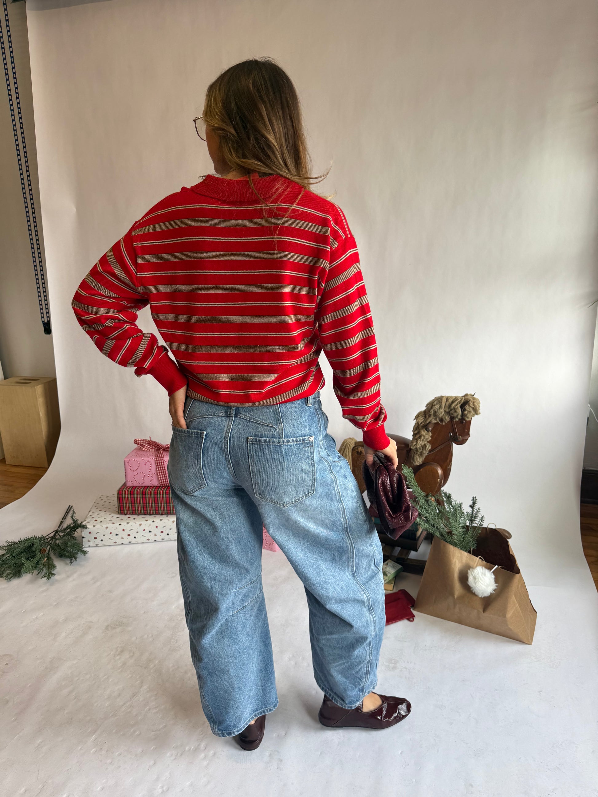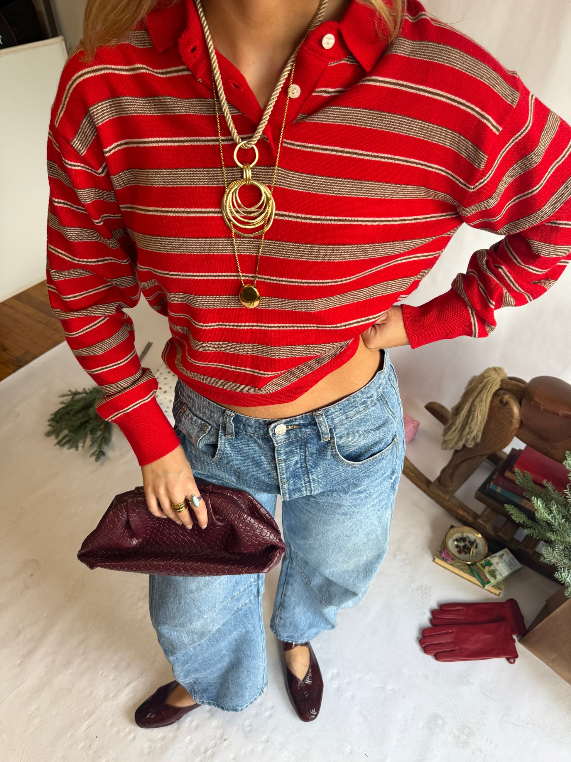 Red sweater with stripe detail. Features three functional buttons and a cashmere soft touch.