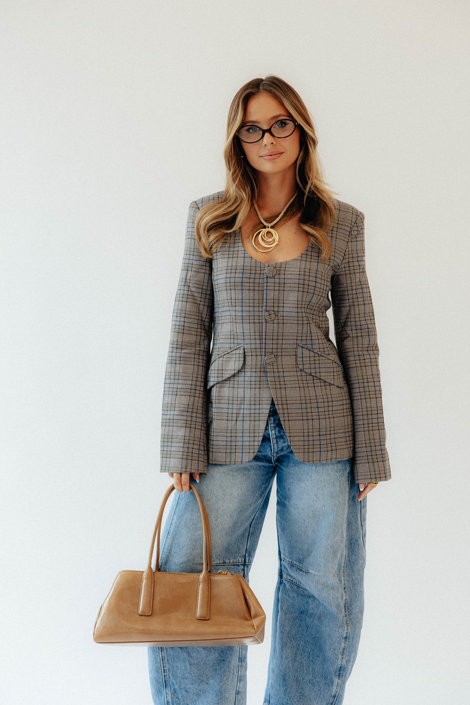 Our Mylie Gingham Jacket features a plaid pattern with tailored fit for a polished look and a deep scoop neck.