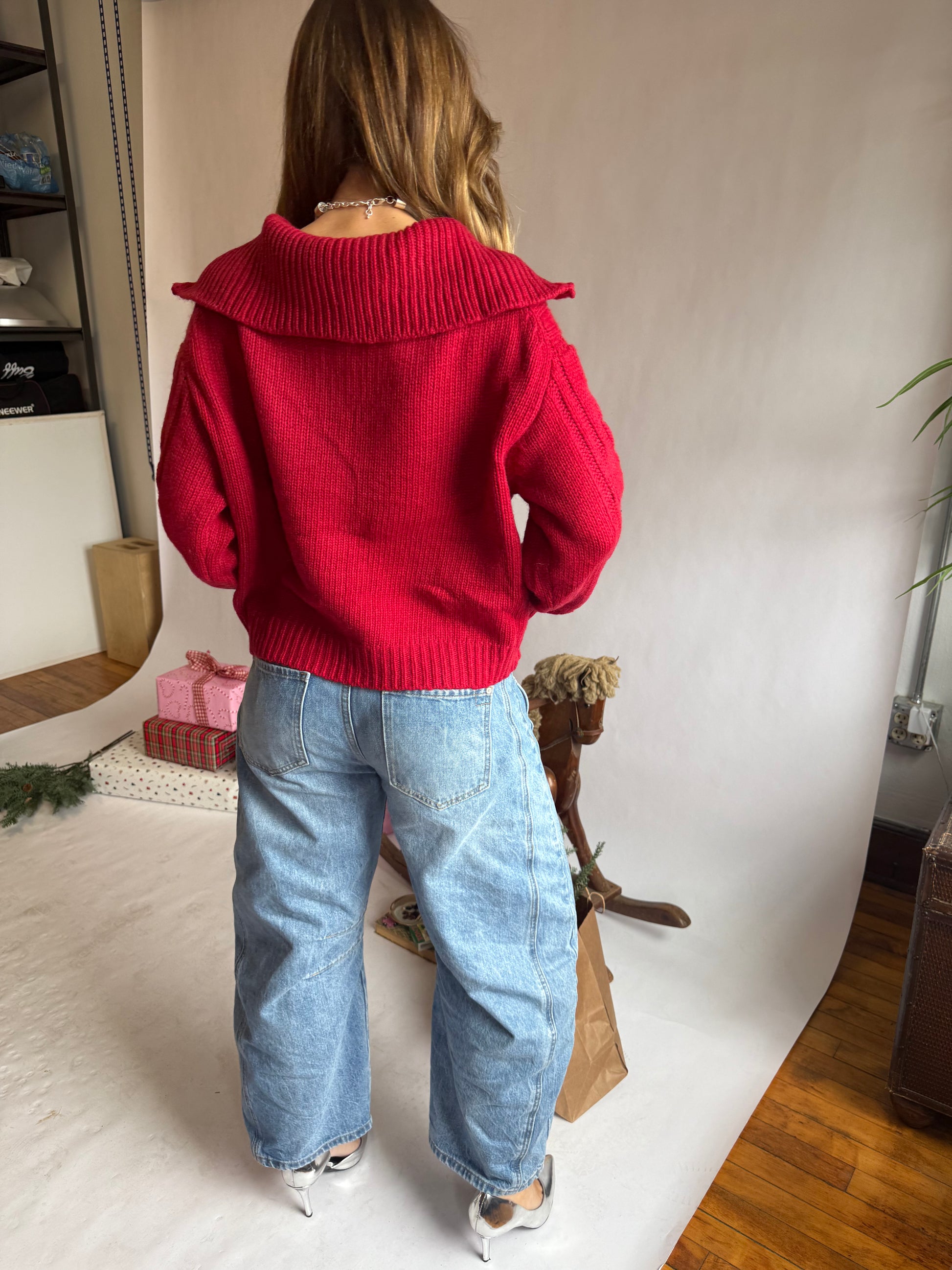 Red long sleeve sweater with a zipper front.