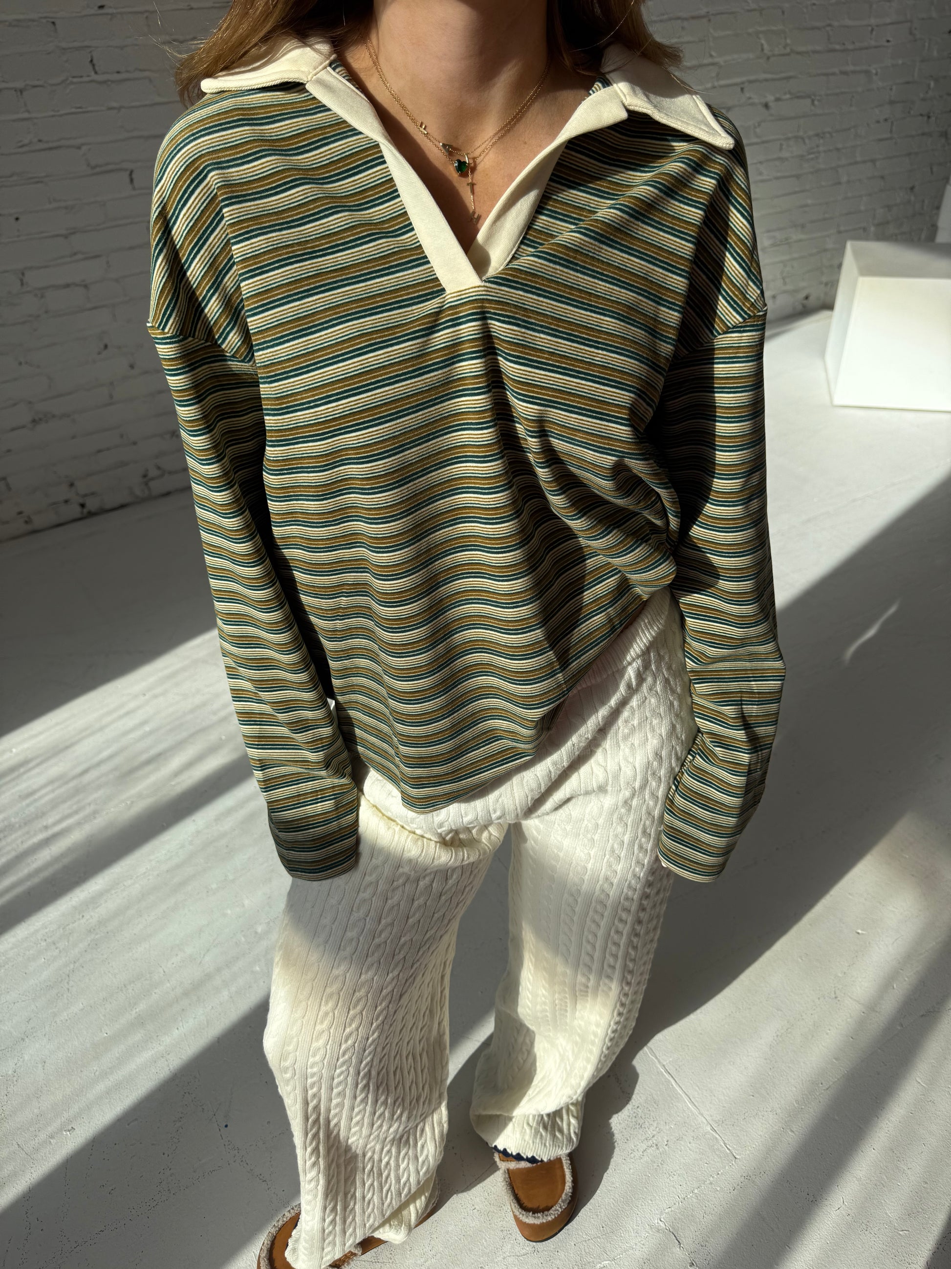 Green striped collared rugby style shirt.
